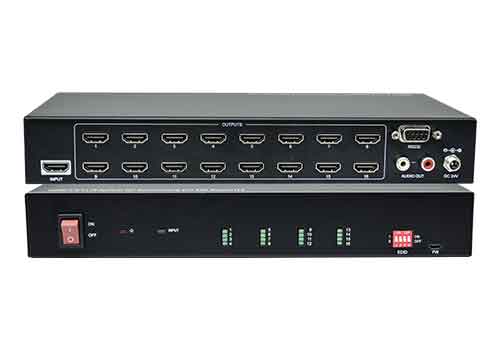 RL-DA16UHD-4K is a HDMI V2.0 1×16 Splitter, which can distribute one HDMI input to sixteen HDMI outputs. It supports 4K signals up to 4K@60Hz 4:4:4, HDR 10, Dolby Vision and features advanced EDID management option using 4-pin DIP switch on the front panel of the unit. It also supports downscaling so a 4K video input can automatically be down scaled to a 1080p output when connecting a display that only supports resolution up to 1080p. Stereo analog L/R audio output is provided for audio de-embedding from HDMI input and the splitter supports CEC and RS232 control.
